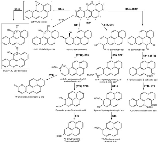 The degradation of BaP has also been demonstrated with the use of a bacterial mixture consisting of Bacillus cereus and Bacillus vireti. These bacteria derived from an enrichment of the refinery soil contaminated with oil products and enriched in the presence of BaP as a sole substrate. This bacterial mixture was found to degrade almost 50% of 500 mg·L−1 of BaP within 35 days [42] (ST21). cis-4-(7-Hydroxypyren-8-yl)-2-oxobut-3-enoic acid was identified as a BaP metabolite, however, since two bacterial strains were employed, this metabolite could not be ascribed to a specific strain.