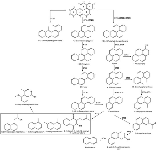 Anaerobic biodegradation pathways of benzo[a]pyrene using three bacteria sprains. ST28: Pseudomonas sp. JP1, ST30: Microbacterium sp. M.CSW3, ST31: Cellulosimicrobium cellulans CWS2. Strains in brackets indicate that this step was predicted, thus was hypothetical. Otherwise, all compounds were identified in the afore-mentioned studies.