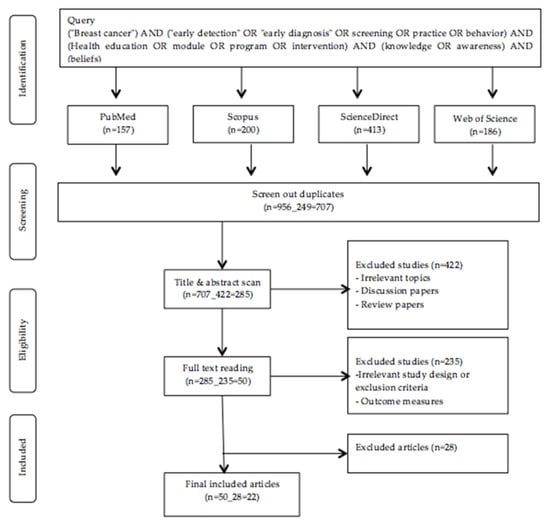 Previous reviews on the effectiveness of educational interventions revealed improved screening rates with culturally relevant components, multiple strategies, language-appropriate interventions, multilevel interventions, personal and cognitive interventions, and model-based educational interventions [37,38,39,40,41,42]. However, these studies only sampled participants from specific countries or regions, which do not offer an international view [39,40,42,43]. Moreover, previous reviews focused on MMG uptake [39], knowledge of BC and BCS, and model-based intervention studies [38], while beliefs have not been explored [21,41,43,44]. Furthermore, the instruments used to evaluate the outcomes affect the quality of findings. The use of standardized, valid, and reliable tools assures high-quality data and simplifies the interpretation of the findings. However, previous reviews found that little is known about the tools used to measure outcomes. A good understanding of these points can help in the development of an effective BCS program for women. Although the program content, methods of delivery, and the person who delivers the intervention play a critical role in improving the knowledge and behavior towards BCS among women, these features have only been reviewed in brief. In this systematic review, these features are reviewed in further detail.