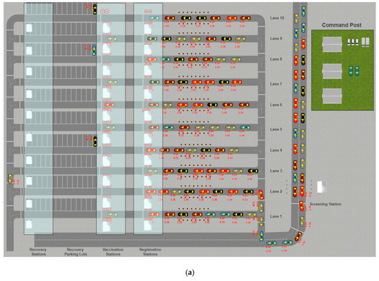 The drive-through model used in this study is a hybrid model consisting of a discrete event and an agent-based simulation. The model contains several agents including passengers, staff, and cars. The physical layout of the drive-through (Figure 1) can be extended up to ten lanes with a maximum area of 20,000 (150 m by 130 m). Passengers entering the drive-through are screened at the screening station to ensure that they meet the vaccination criteria and receive the necessary handout materials. Cars and passengers passed the screening phase move to one of the open lanes for registration, vaccination, and recovery, which can be determined in part by the availability of High Occupancy Vehicle Lane and Pre Registered Lanes. Vaccination will be conducted by professional immunization staff at the vaccination stations. Cars move to one of the available parking spaces located after the vaccination stations. Individuals experiencing complications after vaccination can be taken care of by the relevant staff. Each station is supported by up to four kiosks.