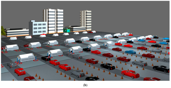 The 2D layout (a) and 3D (b) of the drive-through mass vaccination simulation tool (available at: https://cloud.anylogic.com/model/583c2075-6a8b-41be-8a03-d692eba71683).