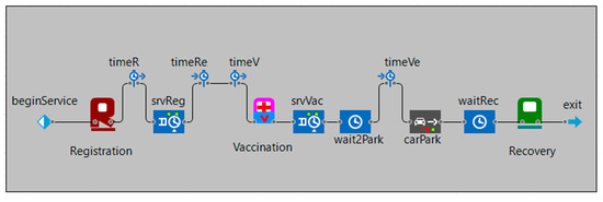 The discrete event model of the drive-through simulation generates the service process for each lane from registration to recovery (Figure 2). Start and end time in each station is measured through time blocks (for example, timer and timeRe refer to the start and end time for registration respectively).