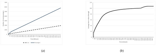 Sample simulation results for number of cars and passengers using the drive-through (a) and average time spent in the drive-through (b) based on drive-through settings in Table 1.