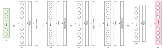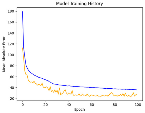 We utilized an 80–20 train-test split to train a 5-layer feed forward neural network, which is shown in Figure 4. We trained the network using the Adam optimizer with a learning rate of 0.001, minimizing the mean absolute error, in batches of 256. Training was stopped after 100 epochs, with the test and validation error displayed in Figure 5.