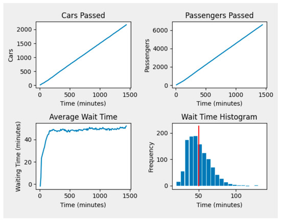 Our final network is 10 Mb in size, which is small enough to be implemented even on the smallest of mobile devices and is able to infer results instantly. More precisely, by entering the parameters (within reasonable ranges) listed in Table 1, our model is able to predict information such as cars and passengers passing through the vaccination center, average wait times throughout the day and overall completion metrics. An example of this can be seen in Figure 6.