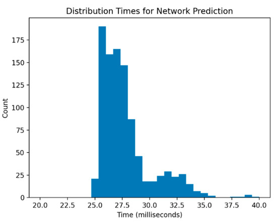 Our neural network model is capable of prediction orders of magnitudes faster than the full simulation model. More precisely, predictions were on average computed in 0.027 s, with minimum and maximum times of 0.025 and 0.039 s, respectively, in a simulation of 1000 random input variations. Distribution of the results can be seen in Figure 7. Notice that the time scale we achieve here is on the order of milliseconds, whereas previously we required minutes to produce these same results. We achieve an improvement of over 3000× in terms of speed, largely due to the computation cost of simulating the entire event. Furthermore, we do all this locally as opposed to the need for cloud computation.