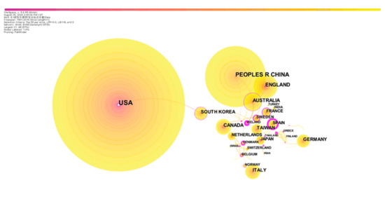 The national or regional network map of safety signs research is shown in Figure 2. It showed that 36.91% of the published papers were from the United States. The following high-publication countries and regions are China (531 articles, 17.1%, excluding Taiwan), England (230 articles, 7.41%), Australia (171, 5.51%), Canada (149, 4.80%), Italy (145, 4.67%), Germany (135, 4.35%), South Korea (123, 3.97%), Japan (89, 2.87%) and the Netherlands (85, 2.74%). The network also indicated that safety signs research started early in the United States, England, Belgium and Australia. In comparison, South Korea, Netherlands and China are emerging countries in this research field. Moreover, about ninety countries and regions have published relevant articles from 1990 to 2019, and Figure 2 shows that both developed and developing areas were conducting research on safety signs. It indicates that safety signs research has already attracted the attention of all countries and regions, and it has become a research hotspot and key issue around the world. However, except for the lines among the UK, Australia and Ireland, other connections between nodes in Figure 2 are sparse, which means the cooperation between countries and regions is not close enough.