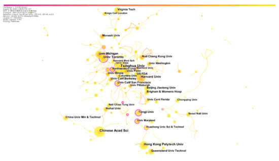 Additionally, the institutions’ cooperation was analyzed, and the network is shown in Figure 3. The colors of lines between institutions in the network shows that institutions’ cooperation has happened more frequently in recent years, but it is not close enough. Moreover, data statistics show that Tsinghua University (35 published literatures), University of Chinese Academy of Sciences (32), Harvard University (27), University of Toronto (26) and the Hong Kong Polytechnic University (25) were the top five institutions. Chinese research establishments accounted for three in the number of published works. Moreover, the centrality of the node known as node importance can be understood as an article’s impact factor. The results of centrality showed that the top seven research institutions of thesis impact were University of California, San Francisco (0.33), University of Maryland (0.31), University of Southern California (0.29), Tongji University (0.28), University of Florida (0.28), University of Toronto (0.22) and Northwestern University (0.21), of which five were American universities and other two were, respectively, from China and Canada. This showed that the United States was in an authoritative position in the field of safety signs research, and both China’s and Canada’s research in this field also had high impacts.