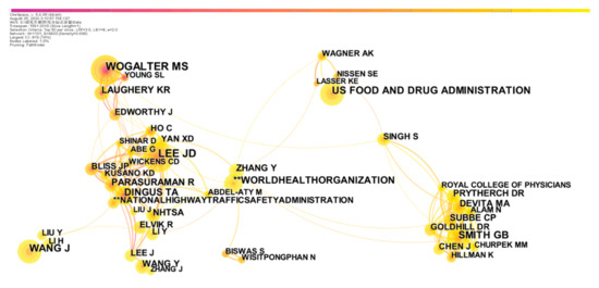 The results of Figure 4 show that the Wogalter and Laughery et al., Lee and Dingus et al., Smith and Devita et al. and Wang et al. were highly cited scholars in the field of safety signs. Wogalter, Smith and Wang also appeared in Table 1. Wogalter has studied the effectiveness and understandability of safety signs and published several studies with Laughery. Smith focuses on early warning systems in medical applications [24]. Wang has great influence in driving safety; he and his co-authors have investigated vehicle collision problems [25]. The research of Lee also focuses on driving safety and has great impact factors. His studies, such as [26], have been cited many times by scholars studying in traffic signs. The above four scholars can be regarded as authoritative researchers of safety signs. In addition, the results also show that the US Food and Drug Administration has played a significate role in safety signs research.