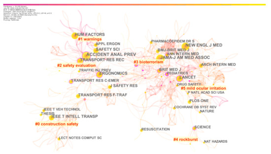 According to the number of articles published in journals, Accident Analysis & Prevention (521), New England Journal of Medicine (410), Journal of the American Medical Association (407), Human Factors (311), Transportation Research Record (310), Lancet (307), Safety Science (304), IEEE Transactions on intelligent Transportation systems (261), Ergonomic (248), Transport Research Part F-Traffic Psychology and Behaviour (237), Journal of Safety Research (210) ranked in the top 10. The data indicated that safety signs were widely studied in medicine, transportation, safety science and human factor engineering, and this conclusion is consistent with the research fields of main authors in Table 1. Figure 5 clusters show the main research fields of safety signs, namely, Cluster#0 (50) “construction safety”, Cluster#1 (46) “warnings”, Cluster#2 (42) “safety evaluation”, Cluster#3 (38) “bioterrorism” (mainly research on child death, infant death and ethnic differences), Cluster#4 (33) “rock burst”, Cluster#5 (32) “mild ocular irritation” (mainly research on the safety of drugs or supplies, such as hair dye).