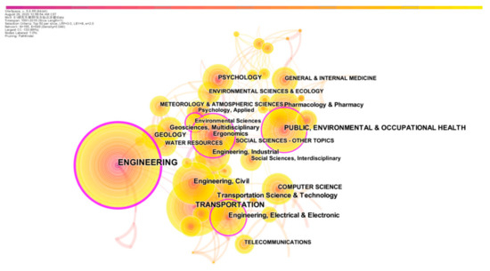 A more intuitive structure of scientific field can be obtained by analyzing the category of safety signs. Only nodes whose citations are greater than or equal to 100 are displayed, and the co-occurrence network of each category is shown in Figure 6. The main scientific fields to safety signs are engineering (36.2%), transportation (17.4%), public, environmental and occupational health (11.3%), traffic science and technology (10.4%), civil engineering (9.2%), electrical and electronic engineering (8.3%), ergonomics (7.5%), computer science (7.1%), pharmacology and pharmacy (6.2%) and industrial engineering (5.6%).