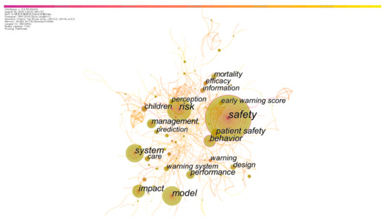 It can be seen from Table 5 that prescription drug packaging labels, injury severity, driving collision, product safety signs, and method efficacy are the hot topics of safety signs research. In addition, the number of burst keywords in each cluster was summarized in the table. In CiteSpace, the more burst nodes of a cluster indicate that the cluster is more active and, to some extent, represents the emerging trends [35]. In the co-occurrence clustering of safety signs keywords, Cluster#1 “injury”, Cluster#0 “physician” and Cluster#3 “consumer product safety” have more burst keyword nodes, which means that the three clusters can represent the active research hotspots of safety signs around the average year of the clustering.