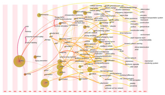 To further analyze the research hotspots, the keyword co-occurrence network is displayed in the time-zone view (Figure 8). The position of nodes had been adjusted to the center of the year bar to obtain a clearer view of the temporal traits of safety signs research topics.