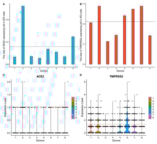 High angiotensin-converting enzyme II (ACE2) and transmembrane serine protease 2 (TMPRSS2) expression levels of type II alveolar (AT2) cells in the lung. (A), (B) and in AT2 cells of 8 samples, respectively. The black dotted lines represent the corresponding average ratios across 8 samples. (C), (D) The expression distribution of ACE2 and TMPRSS2 in AT2 cells across 8 samples, respectively. The red dotted lines represent the corresponding average expression values of gene-expressed cells across 8 samples.