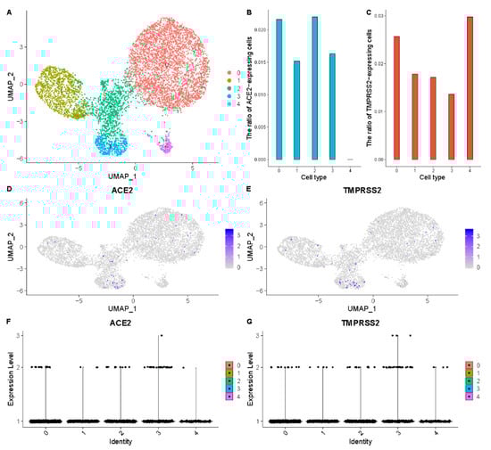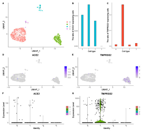 The following are available online at https://www.mdpi.com/1660-4601/18/1/284/s1, Figure S1: The lung scRNA-seq data analysis results (donor 1). (A) UMAP visualization of clustering results for the lung cells. (B) The ratio of ACE2-expressed cells in each cell cluster. (C) The ratio of TMPRSS2-expressed cells in each cell cluster. (D) ACE2 expression level in each cell cluster on the UMAP plot. (E) TMPRSS2 expression level in each cell cluster on the UMAP plot. (F) The expression distribution of ACE2 across each cell cluster. (G) The expression distribution of TMPRSS2 across each cell cluster, Figure S2: The lung scRNA-seq data analysis results (donor 2). (A) UMAP visualization of clustering results for the lung cells. (B) The ratio of ACE2-expressed cells in each cell cluster. (C) The ratio of TMPRSS2-expressed cells in each cell cluster. (D) ACE2 expression level in each cell cluster on the UMAP plot. (E) TMPRSS2 expression level in each cell cluster on the UMAP plot. (F) The expression distribution of ACE2 across each cell cluster. (G) The expression distribution of TMPRSS2 across each cell cluster, Figure S3: The lung scRNA-seq data analysis results (donor 3). (A) UMAP visualization of clustering results for the lung cells. (B) The ratio of ACE2-expressed cells in each cell cluster. (C) The ratio of TMPRSS2-expressed cells in each cell cluster. (D) ACE2 expression level in each cell cluster on the UMAP plot. (E) TMPRSS2 expression level in each cell cluster on the UMAP plot. (F) The expression distribution of ACE2 across each cell cluster. (G) The expression distribution of TMPRSS2 across each cell cluster, Figure S4: The lung scRNA-seq data analysis results (donor 4). (A) UMAP visualization of clustering results for the lung cells. (B) The ratio of ACE2-expressed cells in each cell cluster. (C) The ratio of TMPRSS2-expressed cells in each cell cluster. (D) ACE2 expression level in each cell cluster on the UMAP plot. (E) TMPRSS2 expression level in each cell cluster on the UMAP plot. (F) The expression distribution of ACE2 across each cell cluster. (G) The expression distribution of TMPRSS2 across each cell cluster, Figure S5: The lung scRNA-seq data analysis results (donor 5). (A) UMAP visualization of clustering results for the lung cells. (B) The ratio of ACE2-expressed cells in each cell cluster. (C) The ratio of TMPRSS2-expressed cells in each cell cluster. (D) ACE2 expression level in each cell cluster on the UMAP plot. (E) TMPRSS2 expression level in each cell cluster on the UMAP plot. (F) The expression distribution of ACE2 across each cell cluster. (G) The expression distribution of TMPRSS2 across each cell cluster, Figure S6: The lung scRNA-seq data analysis results (donor 6). (A) UMAP visualization of clustering results for the lung cells. (B) The ratio of ACE2-expressed cells in each cell cluster. (C) The ratio of TMPRSS2-expressed cells in each cell cluster. (D) ACE2 expression level in each cell cluster on the UMAP plot. (E) TMPRSS2 expression level in each cell cluster on the UMAP plot. (F) The expression distribution of ACE2 across each cell cluster. (G) The expression distribution of TMPRSS2 across each cell cluster, Figure S7: The lung scRNA-seq data analysis results (donor 7). (A) UMAP visualization of clustering results for the lung cells. (B) The ratio of ACE2-expressed cells in each cell cluster. (C) The ratio of TMPRSS2-expressed cells in each cell cluster. (D) ACE2 expression level in each cell cluster on the UMAP plot. (E) TMPRSS2 expression level in each cell cluster on the UMAP plot. (F) The expression distribution of ACE2 across each cell cluster. (G) The expression distribution of TMPRSS2 across each cell cluster, Figure S8: The lung scRNA-seq data analysis results (donor 8). (A) UMAP visualization of clustering results for the lung cells. (B) The ratio of ACE2-expressed cells in each cell cluster. (C) The ratio of TMPRSS2-expressed cells in each cell cluster. (D) ACE2 expression level in each cell cluster on the UMAP plot. (E) TMPRSS2 expression level in each cell cluster on the UMAP plot. (F) The expression distribution of ACE2 across each cell cluster. (G) The expression distribution of TMPRSS2 across each cell cluster, Figure S9: High ACE2 and TMPRSS2 expression levels of the mesenchymal stromal cells, plasma cells in the nasal turbinate epithelial cells. (A) UMAP visualization of clustering results for the nasal turbinate epithelial cells. (B) The ratio of ACE2-expressed cells in each cell cluster. (C) The ratio of TMPRSS2-expressed cells in each cell cluster. (D) ACE2 expression level in each cell cluster on the UMAP plot. (E) TMPRSS2 expression level in each cell cluster on the UMAP plot. (F) The expression distribution of ACE2 across each cell cluster. (G) The expression distribution of TMPRSS2 across each cell cluster, Figure S10: High ACE2 and TMPRSS2 expression levels of the mesenchymal stromal cells, plasma cells in the nasal brushing epithelial cells. (A) UMAP visualization of clustering results for the nasal brushing epithelial cells. (B) The ratio of ACE2-expressed cells in each cell cluster. (C) The ratio of TMPRSS2-expressed cells in each cell cluster. (D) ACE2 expression level in each cell cluster on the UMAP plot. (E) TMPRSS2 expression level in each cell cluster on the UMAP plot. (F) The expression distribution of ACE2 across each cell cluster. (G) The expression distribution of TMPRSS2 across each cell cluster, Figure S11: High ACE2 and TMPRSS2 expression levels in the nasal airway epithelial cells. (A) UMAP visualization of clustering results for the airway epithelial cells. (B) The ratio of ACE2-expressed cells in each cell cluster. (C) The ratio of TMPRSS2-expressed cells in each cell cluster. (D) ACE2 expression level in each cell cluster on the UMAP plot. (E) TMPRSS2 expression level in each cell cluster on the UMAP plot. (F) The expression distribution of ACE2 across each cell cluster. (G) The expression distribution of TMPRSS2 
