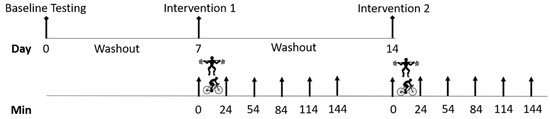 = blood sample; Min = minutes. The high-intensity cycling exercise and resistance exercise were completed in a random order, with venous blood samples collected immediately before and after exercise, and then every 30 min, for two hours.