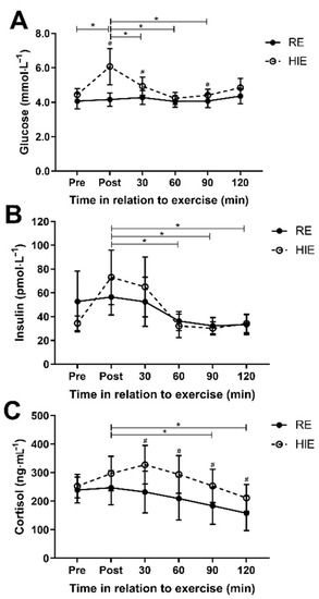 Responses to high-intensity interval exercise (HIE) and resistance exercises (RE) for plasma glucose (A), plasma insulin (B) and plasma cortisol (C). Data shown are mean and 95% CI. # Indicates a post hoc difference between exercise mode after a significant interaction effect was identified (p < 0.05). * Indicates a significant pairwise comparison after Bonferroni correction (p < 0.05) tested after a significant main effect for time was identified. Time of measurements were immediately pre- and post-exercise, and then 30, 60, 90 and 120 min after the completion of exercise.