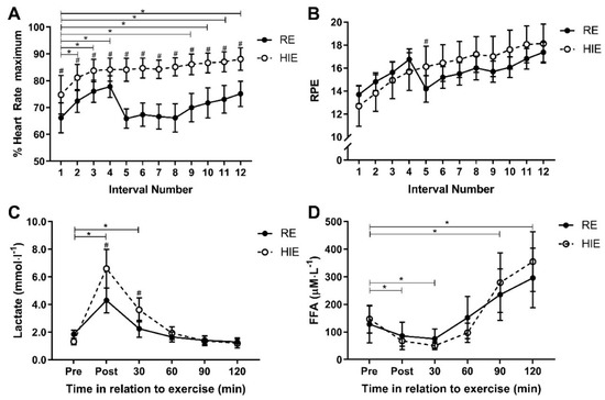 A significant interaction effect for HR response (f = 11.2(3.6), p < 0.001; ηp2 = 0.45) and RPE response (f = 7.7(3.1), p < 0.001; ηp2 = 0.36) was present between trial and time. Mean exercise intensity, measured as %HRmax across the 12 intervals, was 13% (10% to 17%) higher (f = 67.2(1), p < 0.001) with HIE (84% ± 7.4%), compared to RE (71% ± 7.5%), and %HRmax was higher following each HIE bout than each RE bout (p < 0.04; Figure 3A). However, mean exercise intensity measured by RPE, was similar (f = 0.3(1), p = 0.605) for each HIE (16 ± 2.8) and RE (16 ± 1.3), with RPE only different between modes after the fifth work interval (1.9 (0.4 to 3.5); t = 2.7(15), p = 0.016; Figure 3B). A significant interaction effect between trial and time for lactate (f = 11.8(1.3), p = 0.001; ηp2 = 0.44) suggested a difference in anaerobic energy utilisation (Figure 3C). Mean lactate concentration was 0.76 (0.20 to 1.33) mmol∙L−1 higher (f = 8.4(1), p = 0.11) following HIE, as compared to RE. Lactate was higher following HIE, as compared to RE, immediately after exercise (2.30 (0.85 to 3.75); t = 3.4(15), p = 0.004) and 30 min after exercise (1.37 (0.47 to 2.26); t = 3.3(15), p = 0.005). The pattern of lactate response was not statistically affected by trial order (f = 3.4(1.4), p = 0.067; ηp2 = 0.20). There was no interaction between trial and time for FFA response (f = 3.0(1.7), p = 0.076; ηp2 = 0.17; Figure 3D).