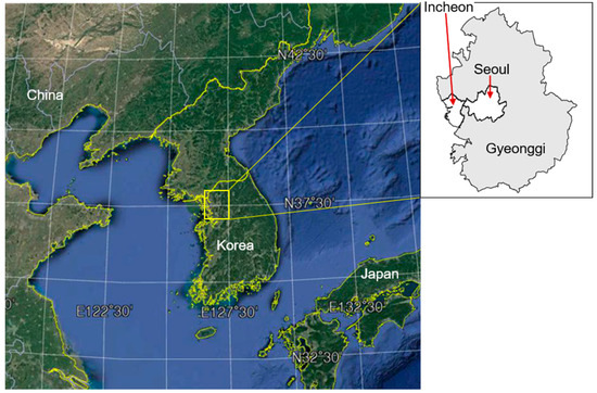 Locations of Seoul metropolitan area (SMA; yellow box in left figure), including Seoul proper, Incheon, and Gyeonggi (right panel). The background map was obtained from © Google Maps.