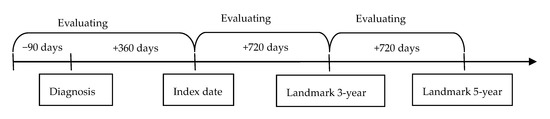 SAS version 9.4 (SAS Institute Inc., Cary, NC, USA) was employed for all the analyses in the current study. First, the fibrate population and non-fibrate users were matched by propensity score matching which corporate the demographic data, co-morbidities and systemic medications, and the homogeneity of one parameters between the two groups was defined as an absolute standardized difference (ASD) lesser than 0.1. The descriptive analysis was used for the presence of basic characters. Then the incidence rate and related 95% confidence intervals (CI) of any AMD, dry-AMD and nAMD were calculated via the use of Poisson regression. After that, the Cox proportional hazard regression was used to produce the adjusted hazard ratios (aHR) of any AMD, dry-AMD and nAMD by incorporating the preceding demographic data, co-morbidities and systemic medications. Also, the Kaplan–Meier curve was drawn to demonstrate the cumulative incidence proportion of AMD between the study and control groups. For the sensitivity analysis, patients in the study and control groups were analyzed by the difference of age, gender and the use of other systemic medications. Furthermore, the MPR of fibrate was calculated which had been used as an index of medical compliance previously [22]. We conducted the landmark analysis to survey whether the MPR of fibrate would influence the development of AMD. Except the initial index date, there were two more landmark points after the index date which means three and five years after the diagnosis of dyslipidemia-related diseases, and the landmark analysis only included the patients who were at risk at the landmark time point (Figure 1). Moreover, the MPR in the landmark analysis was divided into the baseline MPR, past MPR and current MPR based on the date of landmark time point. The MPR was categorized into lesser than five percent, five to ten percent and more than ten percent in the past and current analysis, while the category of baseline MPR is ranged from five percent to more than 20 percent. Then the interaction of MPR degree and MPR time status on the risk of AMD was evaluated and the details were shown in Table 1. Statistical significance was set at p < 0.05. A p value lesser than 0.0001 was depicted as p < 0.0001.