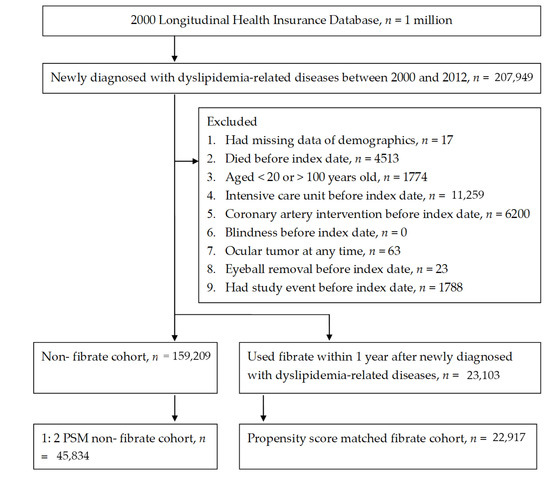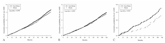 The primary outcome of the current study is the development of AMD which is according to (1) the receipt of a diagnosis of AMD; (2) the arrangement of optical coherence tomography before or at the time of AMD diagnosis; and (3) the AMD diagnosis was made by an ophthalmologist. Moreover, the incidences of dry-AMD and neovascular AMD (nAMD) were analyzed separately to find the effect of fibrate on different AMD subtypes. The definition of nAMD was based on the coexistence of ICD-9 diagnostic codes of AMD and the use of anti-vascular endothelial growth factor therapy according to the related ATC codes since the anti-vascular endothelial growth factor therapy is always used to manage nAMD [16].