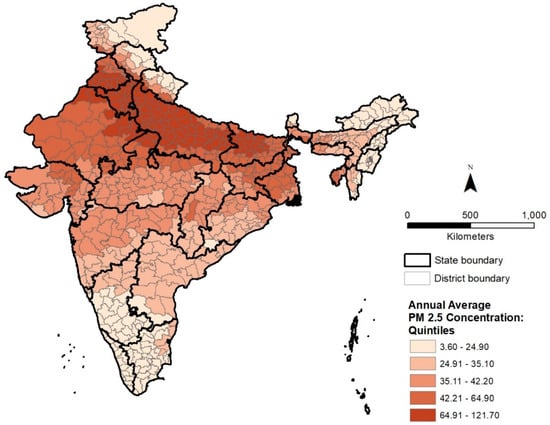 Ambient particulate matter pollution was defined for this study as the population-weighted annual average mass concentration of particles with an aerodynamic diameter less than 2.5 micrometers (PM2.5) in a cubic meter of air, at a spatial resolution of 0.01° × 0.01° over the globe (approximately 11 × 11 km at the equator). Specifically, we utilized surface PM2.5 concentrations estimated by Van Donkelaar et al. [14] using a combination of aerosol optical depth data from multiple satellite products and a global chemical transport model using global emission inventories, subsequently calibrated to ground-based observations of PM2.5 using geographically weighted regression (GWR). This methodology and data have been used in several other studies focusing on PM2.5 pollution in India [1,3,8,9].