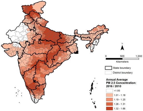 Distribution of 2016/2010 ratio of annual average PM2.5 concentrations (μg/m3) by district in India.