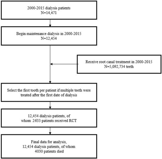 The procedures of RCT included open chamber, root canal cleaning, and enlargement by either rotary or hand instruments, copious irrigation, and obturation by Gutta-Percha. The procedures and quality followed the therapeutic guidelines and were checked and verified by board-certified endodontist. In this study, we used outpatient data to identify maintenance dialysis patients according to their RCT codes and to classify them into two groups: non-RCT (no codes) and RCT (codes 90001C, 90002C, 90003C, 90004C, or 90015C). RCT was performed after the initiation of dialysis. Subjects with RCT were identified when the first tooth received RCT if multiple teeth were treated after beginning dialysis.