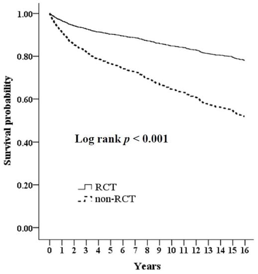 SAS software (SAS System for Windows, version 9.2; SAS Institute, Cary, NC, USA) was used to perform all statistical analyses in this study. Descriptive statistics were used to analyze the demographic data and the distribution of each variable among the study population. Continuous variables were described as the mean ± statistical difference (SD) and were compared using independent t-test analysis of variance. Categorical variables were described as proportions and compared using the chi-square test. The chi-square test was used to compare each variable in the groups of patients with and without RCT. The cumulative proportion of patients with and without RCT was calculated using the Kaplan–Meier method, and the difference in survival was determined by the log-rank test. Univariate and multivariate analyses were performed with the Cox proportional hazards model. To adjust for potential confounding factors in the relationship between comorbidity, multivariate analysis was used. A p-value of < 0.05 was considered statistically significant.
