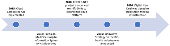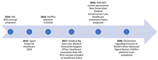 By 2015, the government had started to envision the development of public healthcare innovations through the adoption of emerging technologies [83]. In the same year, a “Working group on information and communication technology usage in the area of health care” was launched, which proposed the innovative concept of Person-centered Open Platform for Wellbeing (PeOPLe). According to this concept, health data generated throughout the life course of a person can be connected and integrated for use by both healthcare professionals and patients. The MHLW took up the recommendations of this working group to set up the “Administrative reform promotion office for health data” in 2017, which aimed to implement a model that would enhance seamless usage of data by both healthcare and long-term care professionals. Subsequently, steps were taken that enabled online claims systems, helped develop medical information databases, and encouraged hospitals to explore innovative ways of using health data for improved systems and better patient outcomes [79]. A major milestone was achieved in 2017, when the government legalized the use of big data (including cloud applications) in healthcare through the Medical Big Data Law, which detailed provisions for handling personal medical data and telemedicine, and covered online consultation within health insurance [84]. In the same year, the Personal Information Protection Act was passed, which established standards for careful handling of EHRs compared to other forms of personal information [85].
