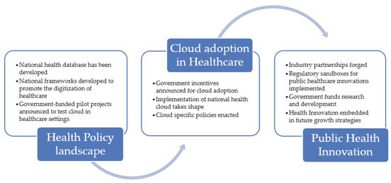 Cloud adoption usually faces sector-specific drivers and barriers [4]. In terms of barriers, issues such as data protection and privacy, lack of interoperability, inadequate laws, cybersecurity concerns, maintenance requirements, national priorities and context, inadequate funding, and skills availability [5] can hinder efforts to adopt cloud computing on a large scale. However, governments are increasingly adopting cloud computing in key sectors such as healthcare, education, and financial services since it delivers in terms of cost savings, scalability, productivity [6], and open innovation [7,8,9,10]. While several studies discuss cloud adoption in public healthcare [11,12,13,14,15,16,17,18,19], there is lack of discussion on how cloud adoption leads to public health innovation, especially in Asia.