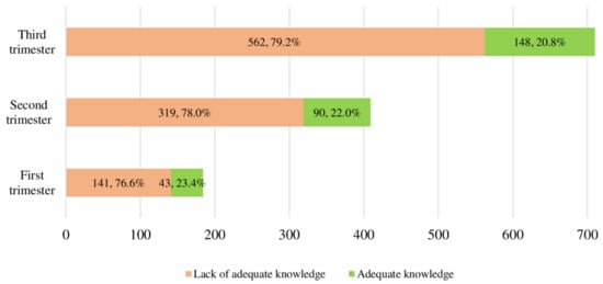 Categorizing pregnant women into having a lack of adequate (total score = 0–5) and adequate (total score = 6–10) knowledge, revealed that 78.4% of pregnant women lacked adequate knowledge on the mode of delivery (Table 2). Surprisingly, the proportion of pregnant women with a lack of adequate knowledge on the mode of delivery was similar (p = 0.734) across the three gestational trimesters (Figure 1). There was only a 2.6% increase in the proportion of pregnant women with adequate knowledge from the first to the third gestational trimester (Figure 1).