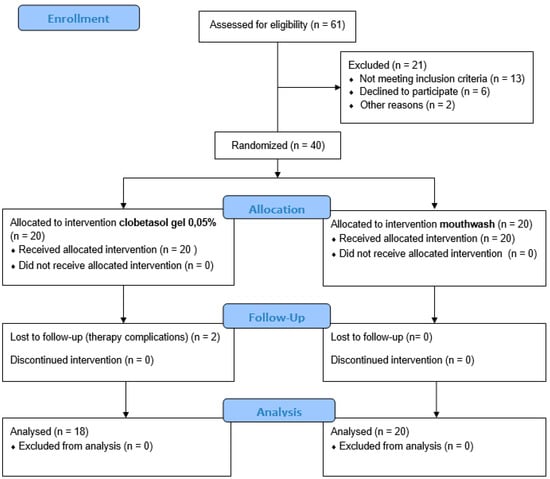 At baseline, a total of 61 patients were enrolled. However, after the first screening, 21 patients were excluded because they did not meet the inclusion criteria (n = 21), declined to participate (n = 6) or were absent at the first visit (n = 2). Finally, a total number of 40 patients (14 female and 12 male) with symptomatic OLP, aged between 27 and 80 years (mean age of 71.91), were enrolled and assigned to the clobetasol group (n = 20) and the anti-inflammatory group (n = 20).