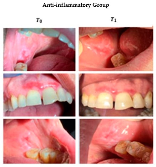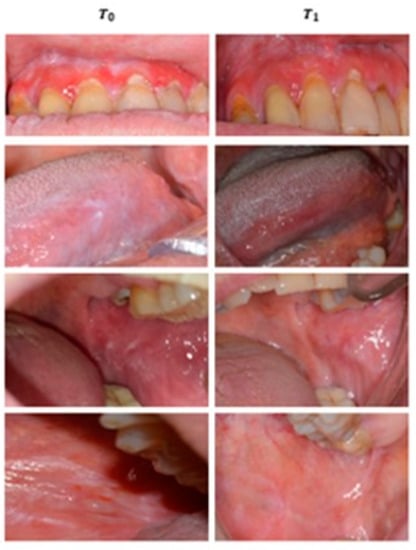 Intra-oral photos of some of the subjects who joined the clinical trial at T0 and T1. The action of the drug on the lesions can be seen after 12 weeks of treatment (Anti-inflammatory group).