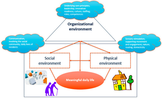 The care environment plays a crucial role to support people with dementia in their daily functioning and well-being. It can be seen as an active part of care and service delivery, especially when the disease progresses and 24-hour care is required. Traditionally, nursing homes for people with dementia are confining, closed environments which are separated from communities [1]. Routines can be rigid and structured with little affordances for residents [1,2,3]. Current evidence suggests that traditional nursing homes are not effective in supporting everyday functioning. For example, nursing home residents are often inactive [4,5], display high levels of neuropsychiatric symptoms such as agitation and depression [6,7], and are restricted in their autonomy as physical and chemical restraints are often used [8,9]. As a result, a cultural change movement has been employed in nursing homes [10,11,12]. The focus is to let people with dementia live their lives as they want to, in a self-determined manner.