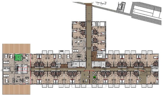 The Homestead has three floors (ground, first and second), and offers a living environment for 52 people with dementia. Figure 3 shows the floor plan of the first floor. In order to respect the privacy of residents and to facilitate their autonomy in terms of self-care, there are 52 individual rooms for residents with their own sanitary facilities. Furthermore, there are communal kitchens, living rooms and activity areas. To support residents’ agency and freedom, all residents have direct access to the outdoors, regardless of where they live in the Homestead. This means that paths, access roads and places are created on all floors that support residents to go outside and seek contact in the general outdoor spaces (garden, courtyard, etc.). A portion of the outdoor space has a raised soil-level so that residents from the first floor can walk outdoors without having to take an elevator or stairs. In addition, lines of sight, walking routes, and familiarity are taken into account in the design of the Homestead to make sure residents are able to find their way independently. Orientation to find their own room, living room, or the outdoors are facilitated. All possible spaces and rooms are used to accommodate activities for residents. Hence, there will be no separate areas for nursing staff (e.g., nurses station).