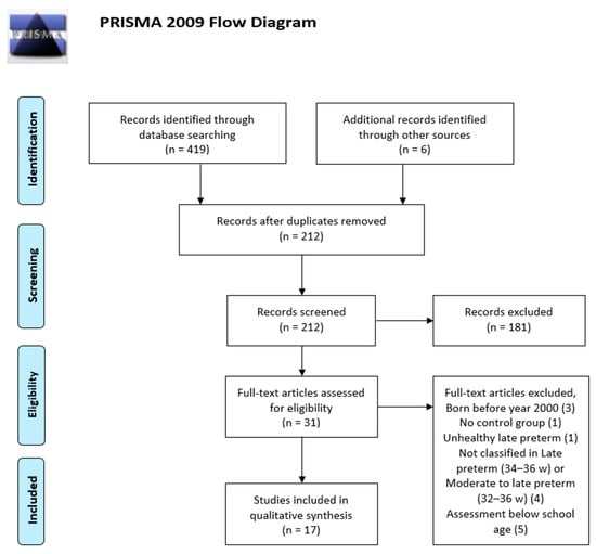 Our review strategy for selecting the studies diverges from the one adopted in previous systematic reviews published in the last decade [31,32,33]. McGowan et al.’s review [31], published in 2011, was centered on data from studies of late preterm found in publications spanning from 1980 to 2010, with a focus on early childhood (from 1 to 7 years of age), health, neurodevelopment and education skills, but including heterogeneous samples of both late preterm admitted for Neonatal Intensive Care and healthy non-admitted late preterm. Another systematic review [32] appeared in 2015 and was focused on the long-term outcomes of late preterm in the motor, cognitive, language and academic domains, reported in studies covering the wide age range 12 months to 18 years and published between 2000 and 2013. Similarly, Chan et al.’s review [33] covered studies published up to year 2013 on cognitive and educational outcomes from late preterm but also including comparisons with full term and early term children. The aim of the present review is to update the knowledge on late preterm learning outcomes and academic performance, focusing on evidence published in the last decade (2010–2019), from studies comparing healthy late preterm children and at term control groups, assessed at some point during pre-school, kindergarten and early school years, and corresponding to cohorts of participants born not earlier than the late 90s (studies based on cohorts born in the 80s or early 90s were excluded). We are selectively interested in studies reporting measurements of learning outcomes, cognitive functioning and/or language skills relevant to academic achievement. Although we were particularly interested in studies adopting a longitudinal approach (two follow up assessments on the same group), those reporting outcomes from a single age group are also included. We aim at identifying types of assessment tools and variables measured adequate to evaluate late preterm children outcomes at different age levels, from kindergarten to primary school levels. Data from the reviewed studies will contribute to identifying major risk factors and domains of difficulty, connected to later academic success. Given the increasing number of late preterm children in our society and the limited number of resources available to systematically implement follow-up protocols in this population, the review can contribute to highlighting potential screening strategies to facilitate early risk detection and to develop guidelines for intervention to minimize the effects of this morbidity in childhood. More generally, our specific contribution with the present review is to offer an updated and more nuanced perspective on the still existent controversial assimilation of healthy late preterm and term-born populations regarding their risk for neurocognitive difficulties and low academic achievement.