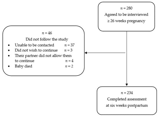 A non-probabilistic sample of 280 pregnant women receiving prenatal care agreed to participate in the parent study. Of these women, 234 (83.6%) were assessed during pregnancy and followed up at six weeks postpartum and were included in this study (Figure 1). Women were approached in the waiting rooms of a hospital that provides comprehensive medical care to state employees and a primary health center that provides prenatal and other medical care to the local community. To be eligible, women had to be at least 20 years of age, ≥26 weeks pregnant, and living in the Mexico City metropolitan area; women with bipolar disorder were excluded. Eligible participants who agreed to be interviewed provided written consent.