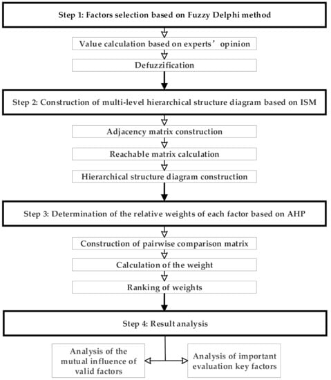 The interpretative structural model (ISM) allows the internal structure of a system to be revealed by processing known but messy system–element relationships [34] and was put forward in 1974 by Warfield [35]. Its basic principle is to decompose the constituent elements of a complex system into several sub-elements. Drawing on a combination of theoretical knowledge, practical experience, and statistical analysis, the system elements are made into a multi-level hierarchical structure diagram. The analytic hierarchy process (AHP) is an effective method for quantitative analysis that was put forward by American operational research scientist, Professor Saaty of Pittsburgh University, in the early 1977s [36,37]. This method emphasizes the mutual influence and restrictions among various factors.