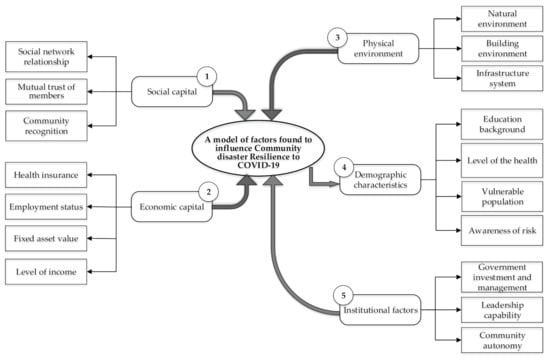 - The weightings of each factor were calculated by using AHP. The demographic characteristics of the population were found to be the main factors, followed by economic capital accounting for 0.2189. Social network relationship, trust, income level, built environment, infrastructure, vulnerable groups, and risk awareness were the main factors found to influence the resilience of the community to COVID-19.