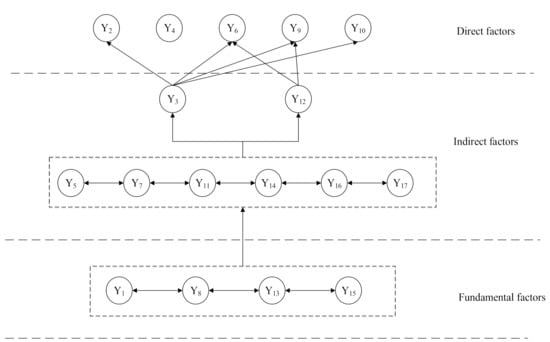 The interpretative structure model diagram of the multi-level hierarchical structure is obtained by dividing the levels. The multi-level hierarchical structure, composed of direct factors in the surface layer, indirect factors in the middle level, and fundamental factors in the deep layer, was obtained by an interpretative structure model (ISM), as shown in Figure 4.