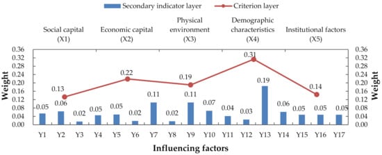 It can be seen from Figure 5 that among the factors influencing urban community resilience, the population characteristics are the main factors, with the weight of 0.3130, followed by economic capital accounting for 0.2189. Across all levels, the main influencing factors are found to be social network relationship, member trust, income level, construction environment, infrastructure, vulnerable groups, and risk awareness. The four factors of vulnerable groups, construction environment, income level, and member trust account for a large proportion, among which the vulnerable group accounts for the largest weight of 0.1853.