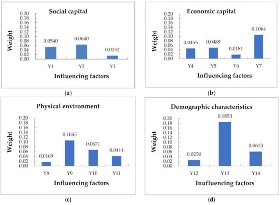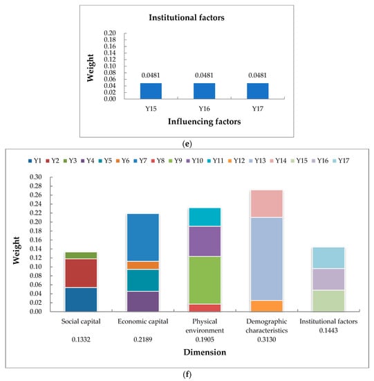 The weight of influencing factors of each dimension. (a) Social capital dimension; (b) economic capital dimension; (c) physical environment dimension; (d) demographic characteristics dimension; (e) institutional factors dimension; (f) comparison of each dimension.