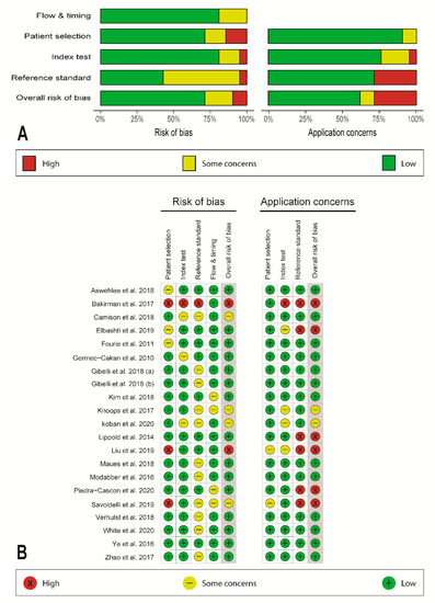 - Whiting, P.F.; Rutjes, A.W.; Westwood, M.E.; Mallett, S.; Deeks, J.J.; Reitsma, J.B.; Leeflang, M.M.; Sterne, J.A.; Bossuyt, P.M.M.; The QUADAS-2 group. QUADAS-2: A revised tool for the quality assessment of diagnostic accuracy studies. Ann. Intern. Med. 2011, 155, 529–536. [Google Scholar] [CrossRef] [PubMed]