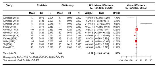 - Higgins, J.P.T.; Thompson, S.G.; Deeks, J.J.; Altman, D.G. Measuring inconsistency in meta-analyses. BMJ 2003, 327, 557–560. [Google Scholar] [CrossRef] [PubMed]