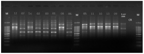 - Van Der Zee, U.; Verbakel, H.; Van Zon, J.C.; Frenay, I.; Van Belkum, A.; Peeters, M.; Buiting, U.; Bergmans, U. Molecular genotyping of Staphylococcus aureus strains: Comparison of repetitive elemento sequence-based PCR with various typing methods and isolation of a novel epidemicity marker. J. Clin. Microbiol. 1999, 37, 342–351. [Google Scholar] [CrossRef] [PubMed]