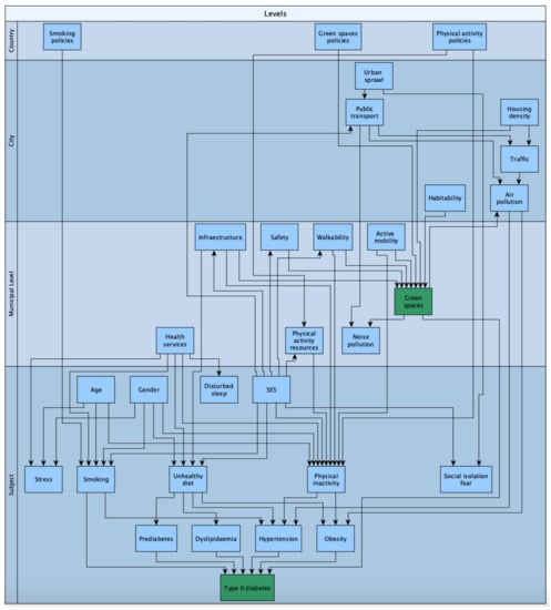 Scheme of multilevel dependency on green-space exposure and related variables. Source: own elaboration.