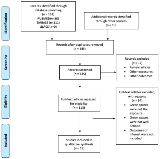 Figure 2 shows the PRISMA flow diagram for the search, identification, and selection of the articles included in this systematic review. Firstly, 161 articles were found on PubMed and Embase; no article was found on the LILACS database. Secondly, 10 articles were included from other sources. From a total of 171 articles, 26 were duplicate and were removed. Of the remaining 145 articles, title and abstract were reviewed. As a result, 32 articles were excluded. A total of 113 articles were eligible for full-text review. After reviewing the full text, 94 articles were excluded. A total of 19 scientific articles were included in this systematic review.
