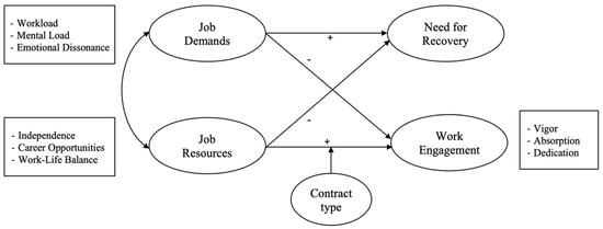 The aim of this study is to focus on a category of temporary workers largely overlooked by the recent literature on work-related stress in academic contexts: fixed-term researchers. We investigated the role of some academic job demands (workload, mental load and emotional dissonance) in predicting a greater need to recover physical and mental energies at the end of the working day. We focused in particular on emotional dissonance, as a particularly influential stress factor in social work [1]. We hypothesized that, being a sample of workers still at the beginning of their academic career, more experienced and versed in research activities than in teaching and in close contact with students, having to pretend emotions that are not actually felt could worsen their levels of well-being, increasing their need for recovery more than any other job demands. At the same time, we also investigated positive factors, such as the degree of independence in carrying out one’s work, the career opportunities offered by the organization and the work–life balance. We assumed that these would have a positive influence on work engagement, while decreasing the stress outcome levels. A comprehensive theoretical framework, the Job Demands–Resources model (JD-R model) [12,13], was used and applied to the investigation of the relationships between above mentioned organizational stressors and resources, and their combined effects on, respectively, need for recovery and work engagement among fixed-term researchers of Italian universities. In this study, we use the type of contract as an indicator of job insecurity (assuming that type a RTDs have a higher level of job insecurity than type b RTDs) to verify its moderating role in the relationship between job resources and work engagement.