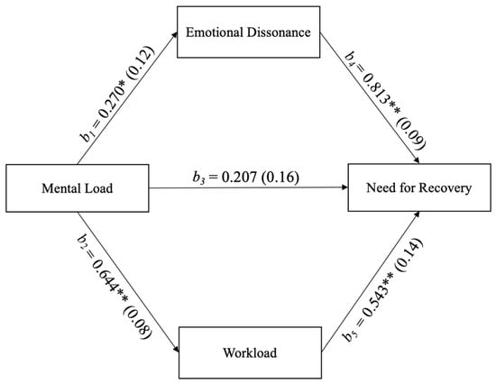 Parallel multiple mediation analysis of the mediators (Emotional Dissonance and Workload) in the relationship between Mental Load and Need for Recovery (n = 157). Note: * p < 0.05, ** p < 0.01.